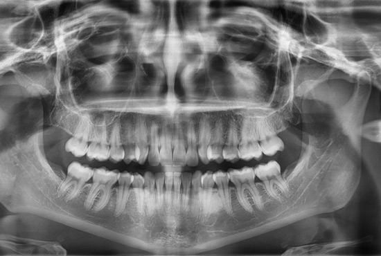 Proporciona una vista panorámica de la estructura dental y maxilofacial, ideal para evaluar el estado general de la mandíbula y los dientes.